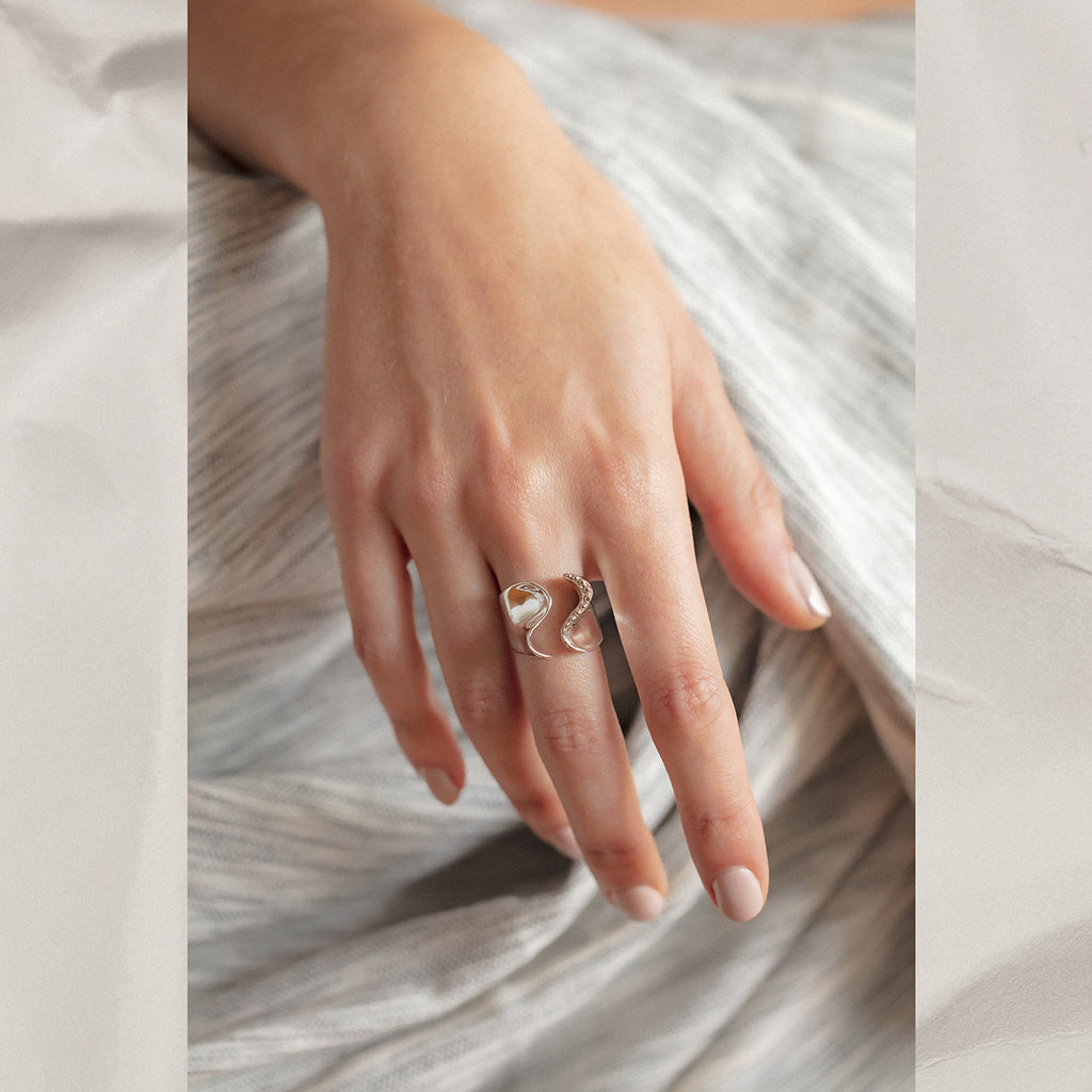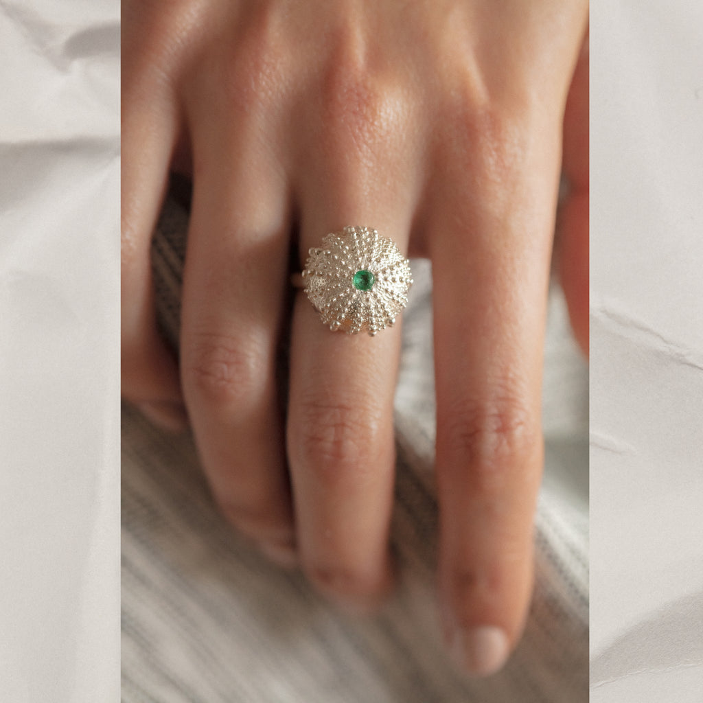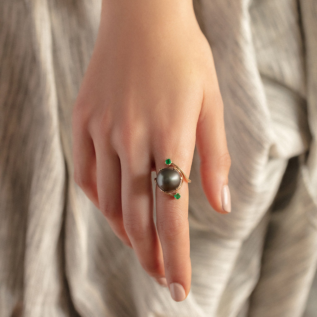 Anillo Perla Tahitiana con Dos Esmeraldas